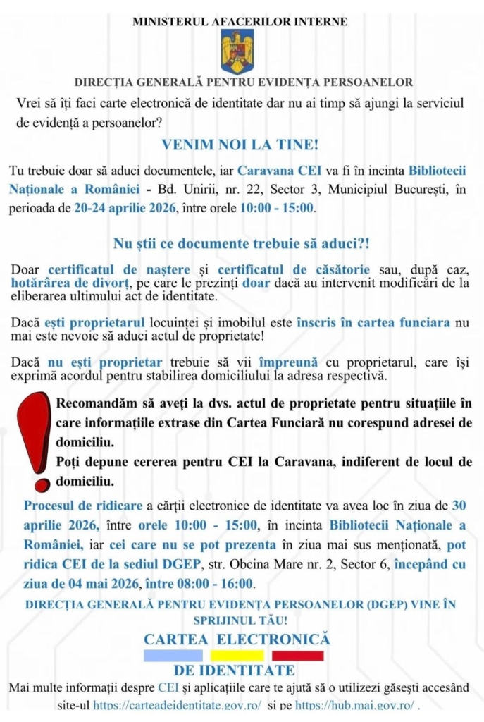 Caravana pentru Cartea Electronică de Identitate a ajuns la Biblioteca Naționala a României și oferă o soluție simplă și rapidă pentru obținerea documentelor. Salutăm demersul Ministerului Afacerilor Interne, care facilitează accesul la servicii și răspunde nevoilor cetățenilor, în spațiul special amenajat în incinta Bibliotecii Naționale a României.